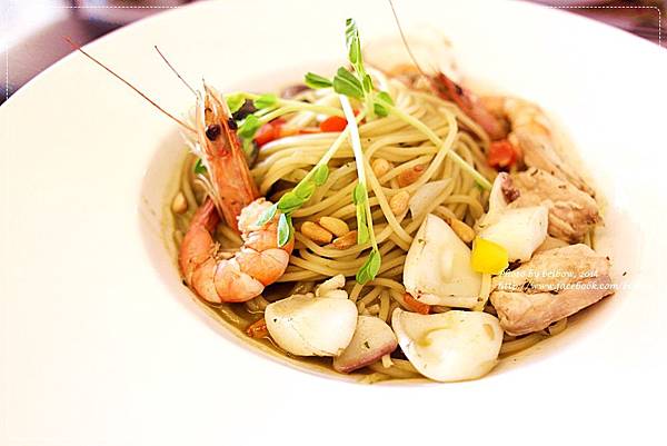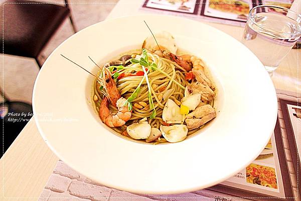 首先上菜的是姊妹點的羅勒松子海鮮義大利麵