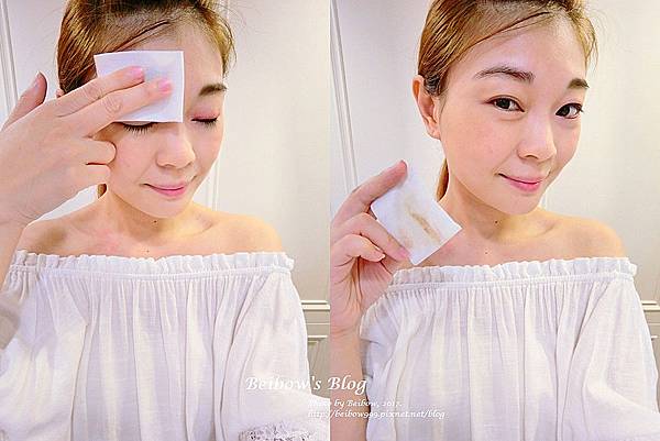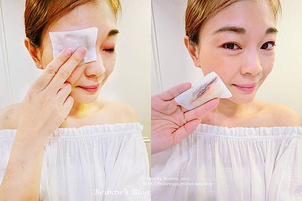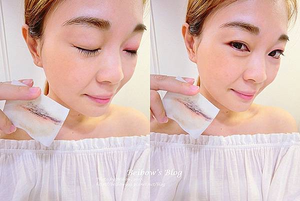 先將卸妝泥均勻在不織布上塗抹開來後.輕敷在眼皮上.等待約30秒後輕輕擦拭